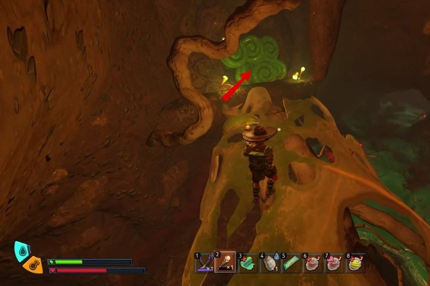 The Wither Sting Staff can be found near the new trash can area in the Fire Pit of the Yard. Go towards the north side of the trash can, and you will find a big root in front of a cave. Enter the cave. Be careful, as you will get attacked by the rust beetles. Defeat them, and at the end of the room, you will find a sour candy. Use your tier-3 omni tool hammer to break it. After that, you will get the Wither Sting Staff.