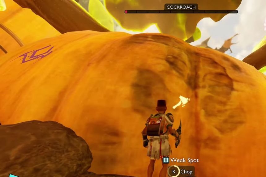 Go towards the Veggie Garden, on the west side of the yard. Look under the vegetable basket near the wall. Inside the wall is a cave. Enter the cave and swim to the underwater area, and keep going straight. You will see a screwdriver that you can climb and jump onto a brick. Now, end the purple-painted cave and defeat a very strong spider. After defeating, you will get the Boomstick as a reward.