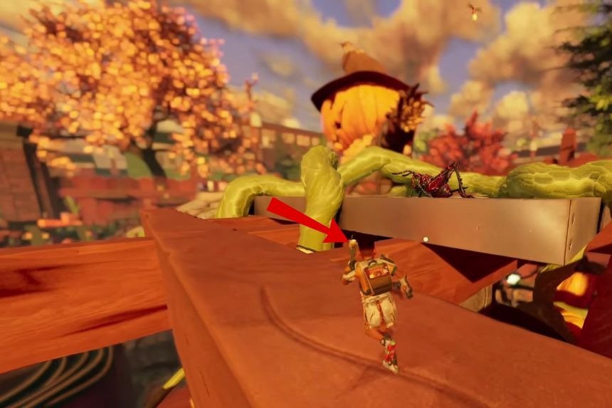Head towards the pumpkin patch and climb onto the stem. From here, drop down into the area in front of you. You will find the Discord Bow lying on the ground. It is perfect for crowd control and support builds. It is a modified Cricket Loot Bow with powerful debuffs and critical hits.
