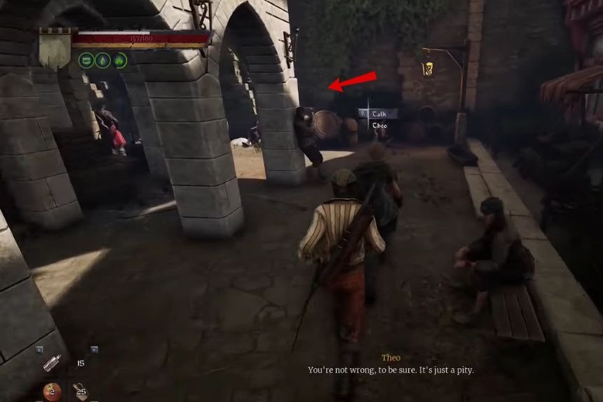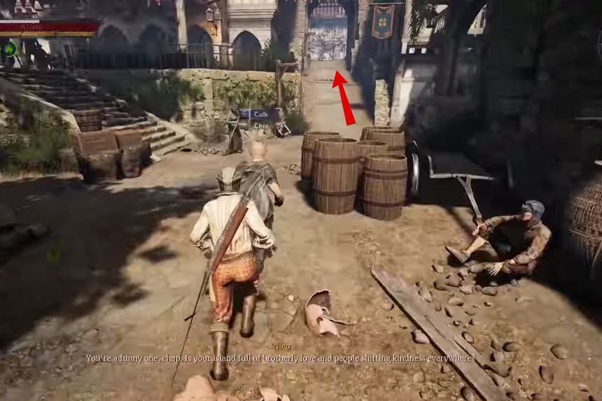 You will soon see a tavern on your left. Pass it and keep following the road. Go up the stairs to cross the bridge, then continue forward and head down the stairs on the left side.