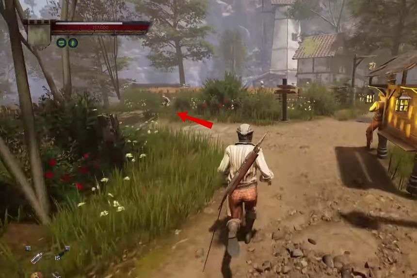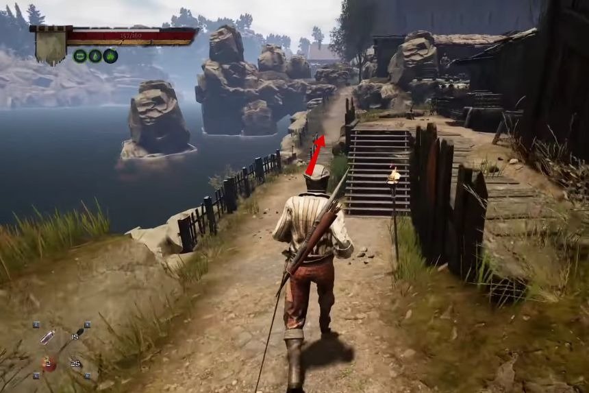 Keep moving forward and cross the wooden bridge. After that, continue straight, and when you reach a puddle, turn left. Follow the path, then head down on the right side.