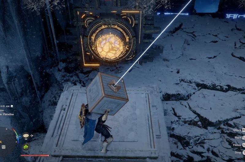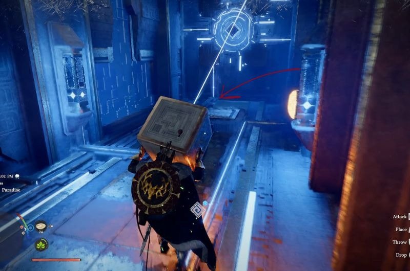 - Grab the Lightning Cube and place it before the Glowing Orb to unlock the invisible wall.