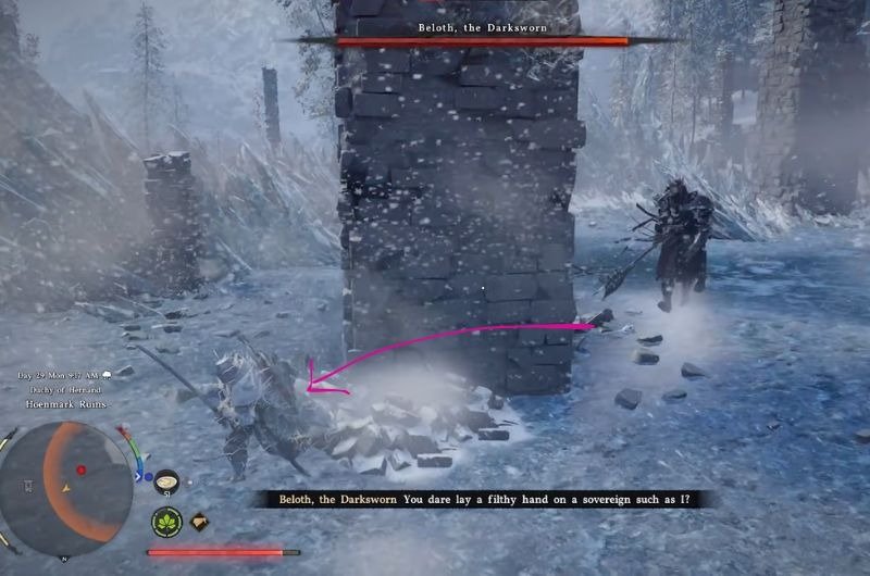 With all the preliminaries aside, now you have to face Beloth head-on. Just when you spawn in the fight, use the Pillars present in the Arena to your advantage and hide behind them. When he attacks the pillars the ice around them would break off, and you would have more space to move around. Circle around the pillar until he finishes his combo, then use Heavy attacks(Right Trigger) to deal damage to him, by peeking out of cover, then immediately roll back. Continue doing this to proceed safely in the fight.