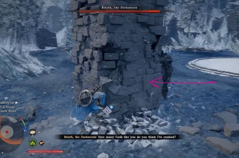 To unlock this boss fight, you first need to finish Chapter 6 of the main story quest, Cracks in the Shield. After that, if you head to the marked location, you’ll be greeted unwelcomingly by the one and only Beloth tyrannizing in the Hoenmark Ruins.