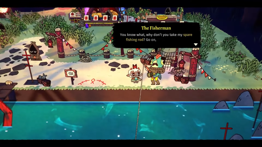 To obtain the fishing rod, you head to the Pilgrim’s Passage and speak to the Fisherman. He mentions that it has been a bad winter for him and asks the Player to provide him with something warm. Give 5 wool to the Fisherman, and he will give you his spare fishing rod.