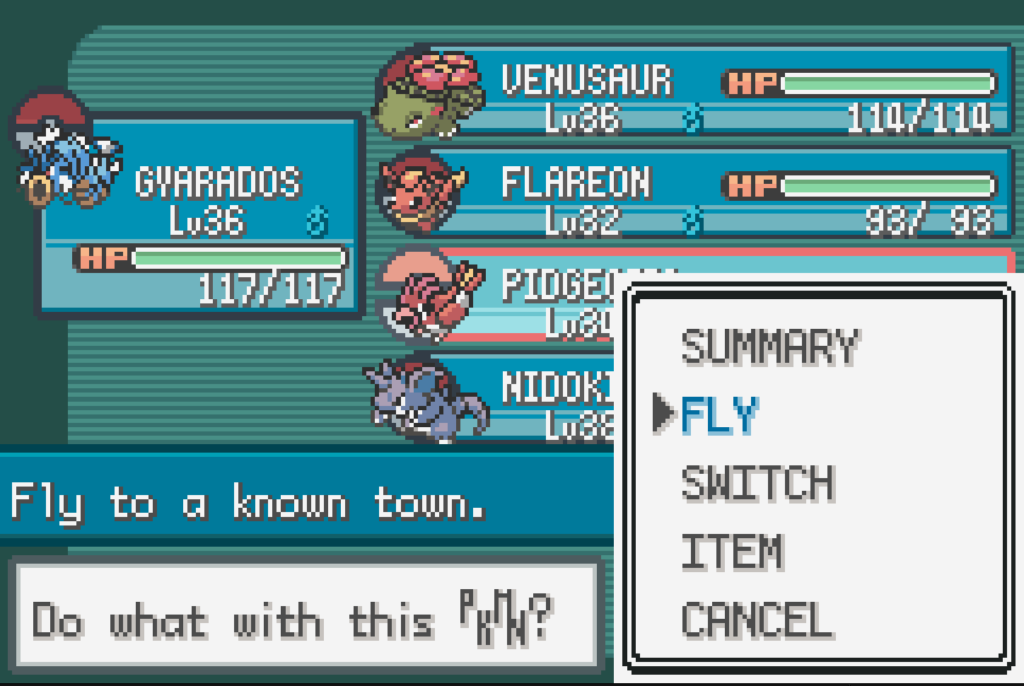 - Fly allows you to fast-travel to previously visited Pokémon Centers.