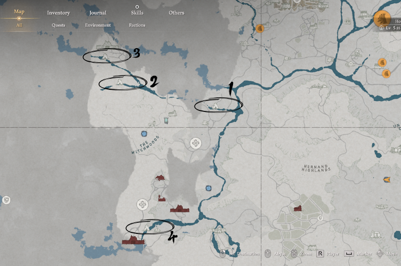 Hidden throughout The Witchwood region are the four pieces of armor that complete the Dark Ringleader’s Set. I’ve marked the locations of the waterfalls on the above map, look for waterfalls which have the stone structure.