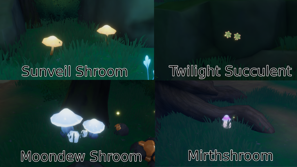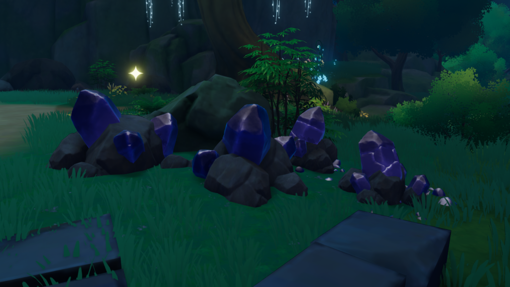 | Fluorite | Glowing yellowish-orange ore. | Crucial for repairing bases in moonlit forest. |