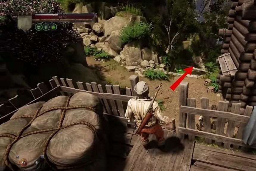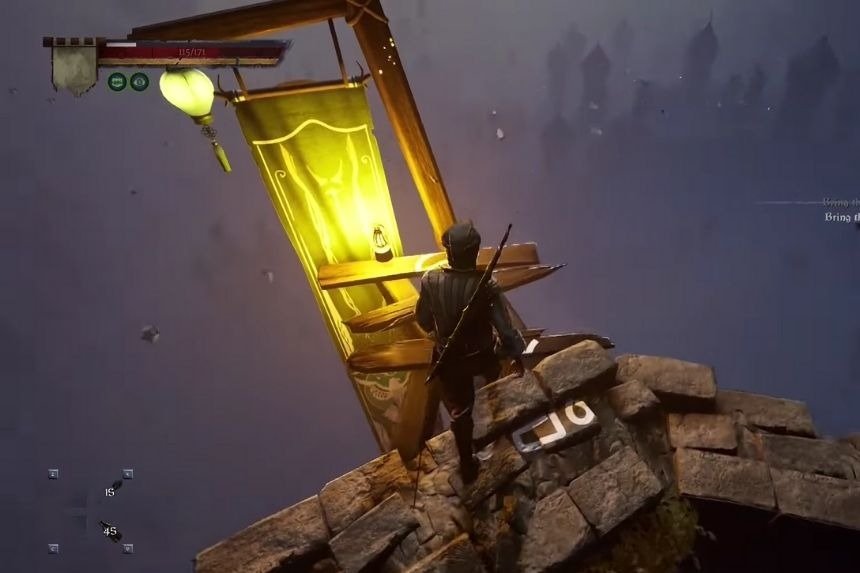 When you reach the tower, climb up. Start jumping from one wooden beam to another. Once you reach the top of the tower, cut a piece of the flag and return it to Morgus. Morgus will give you the second feather.